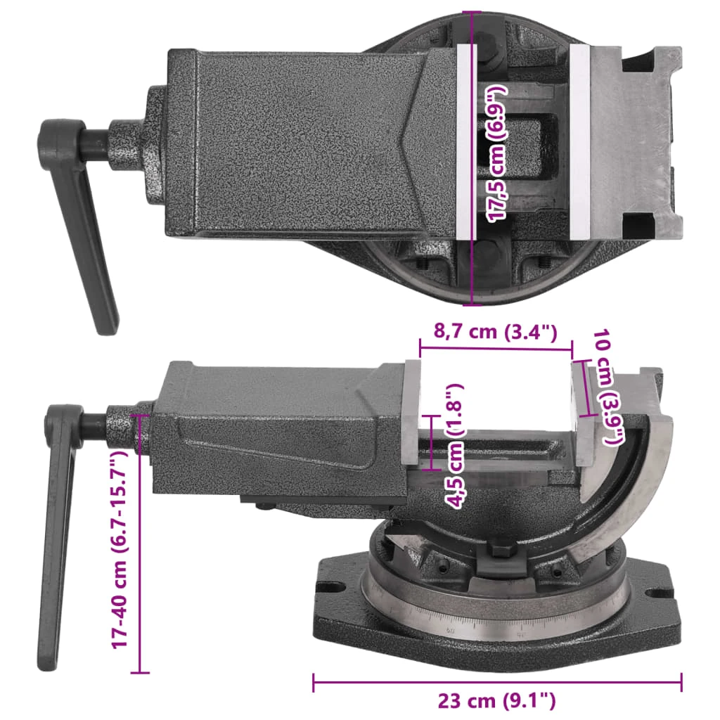 Šīs 2 asu čuguna skrūvspīlēm ir noliekšanas un pagriešanas funkcija un 100 mm žokļa platums. Tām ir stipra vītne vienkāršai un stabilai apstrādājamo materiālu nostiprināšanai.