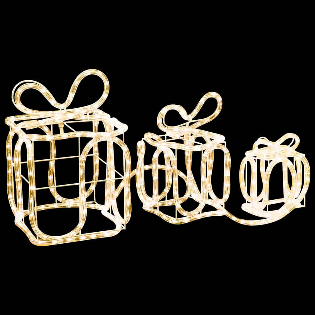 Šīs trīsdimensionālās dāvanu kastes izgaismo silti baltas LED lampiņas, kas piešķir maigu mirdzumu. Šī dekorācija ir piemērota lietošanai gan telpās, gan ārpus tām.